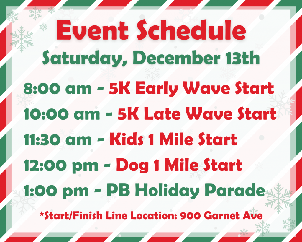 Come dressed in your finest (or ugliest) Christmas attire and be part of this unique holiday celebration. After the runs, stick around to enjoy the annual Pacific Beach Holiday Parade at 1:00 PM. Don’t miss out on the merriment—register today and make this holiday season unforgettable!