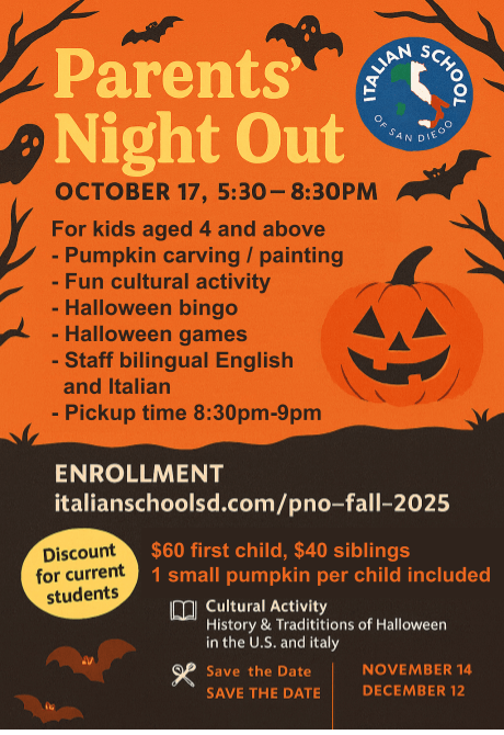 Parents, book your favorite restaurant β Italian School of San Diego is organizing a Halloween themed Parents’ Night Out this October!